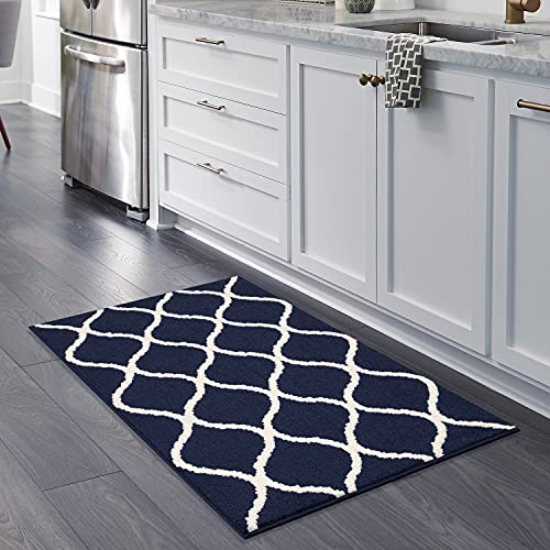 Maples Rugs Rebecca Contemporary Kitchen Rugs Non Skid Accent Area Carpet [Made in USA], 2’6 x 3’10, Navy Blue/White